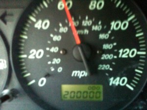 Here I was in conflict. I told her to take the Mazda. I begged her to take the Mazda. I said it had more gas in it. I told her anything I could think of. But I didn’t tell anyone the real reason I wanted her to take the car. Somehow, it seemed on the verge of insanity to speak my plan aloud. Telling people I wanted them to drive my car so that I could watch the mileage change to 200,000 by the end of the week seemed absurd, and slightly embarrassing. So she took the other car. And when my wife drove her home, they took the other car. I was now 30 miles behind.