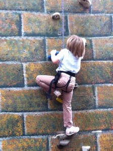 The wall was fairly impressive, and Ruby had never done anything like this before, but she was excited as they hooked her into the harness. As she began her ascent, we shouted encouraging words to her and cheered her on. “Grab the yellow one!” we called out. “Move your foot to the left!”