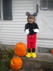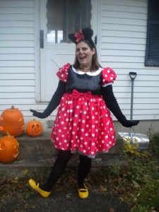 Simone’s Minnie Mouse costume was ordered online, but when it arrived on Saturday (note on your calendars that this was the day before Halloween) it did not include any ears.  Who sells a Minnie Mouse costume without Minnie Mouse ears?  That’s just insanity.  And of course I don’t even need to tell you that on the day before Halloween, all the mouse ears were sold out everywhere.  So we called my mother.  She used some bunny ears, folded them down, sewed black over them and made the bow herself.  She also added a tail to the dress, as that was not included either.  It was more like a Minnie Human costume when we got it, but my mother made it all mouse.