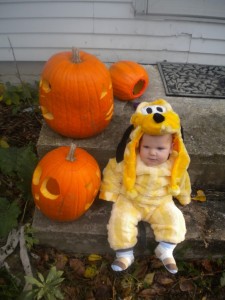 Baby Edward looked great too.  I had found the giant hat in New York and my Mom made the rest.  Sure, most of the time the hat was covering his entire face, but that’s ok, it was cold out!  In fact, when we left for trick of treating, it was hailing.  I think Edward was the warmest one out of all of us!