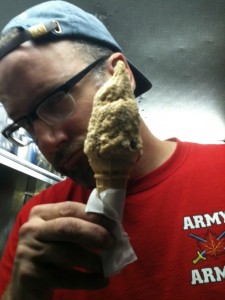 The first thing I have to say about The Big Gay Ice Cream Truck is that it is by far the smallest truck I have found so far.  It was not the size of the truck that was big, but rather the gayness of the truck, and also the ice creaminess that was deliciously big.  When I first arrived at the truck, the vendor told me was having a “Mommie Dearest” moment, with himself.  After a bit of hilarious crashing around, he was ready to take my order.  I decided on the “Bea Arthur,” which is vanilla soft serve, and then he took a bottle of caramel and injected it into the ice cream and finally drizzled it all over the outside.  To top it all off, it was rolled in crushed ‘Nilla Wafers.  Words cannot express how yummy this is.