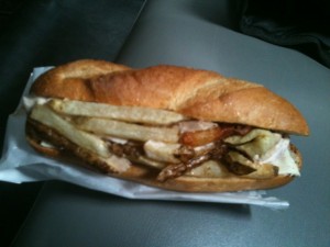 Bistro Truck was not too hard to find, and after purchasing the recommended sandwich of tuna, mortadella, hard boiled egg, veggies, and french fries, I hopped in a cab.  This was a good sandwich.  The only issue I had was that “mixed veggies” basically meant olives, and I think I have a slight allergy to olives.  I’ve only had them three times, but each time I felt really sick afterward, and this was no exception.  Oh well.  It was still a good (if sneaky) sandwich.