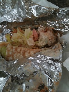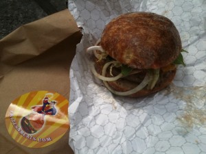 Anyway, full of burger, I reached my second truck of the day.  I had never had a falafel before.  I didn’t even know what a falafel was.  Actually, now that I’ve had one, I still don’t know what a falafel is.  What I got was a pita bread filled with lettuce, tomato, some sort of sauce, and fried balls of something or other.  I guess that was the falafel part?  Or is the whole sandwich called a falafel?  I have no idea.