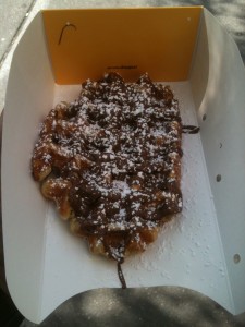 Luckily it was morning and I was hungry for breakfast, because I walked right by the Wafels and Dinges truck!  And I only recognized it because of the picture!  Lucky me.  I know it sounds like Beavis and Butthead named the truck (shut up, dingus.  heh heh), but man, there is nothing like a hot waffle out of a truck on your way to work.  And if said waffle is smothered in Nutella?  All the better.  As Ruby would say, Yum-a-rum!
