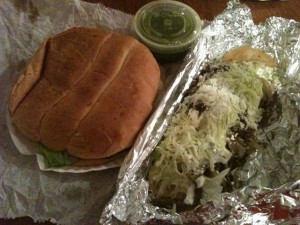 Now here I faced a dilemma.  The rules demanded that I purchase and consume a Tlacoyo, but that sounded foreign and gastronomically terrifying to me.  I compromised with myself and bought two things.  First the tlacoyo, and second, the spiced beef sandwich, which I thought I would like better.  Boy am I dumb.  I didn’t even finish the sandwich.  I mean, it was good and all, but ZOMG the tlacoyo was like eating pure awesome.  It sure looks like a mess, but oh what a delicious mess it was.
