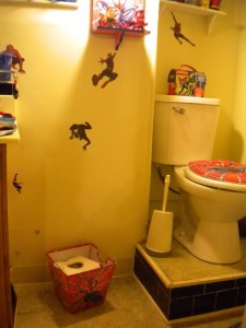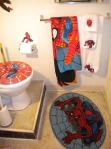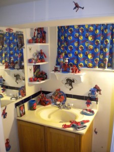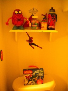 It started out fairly small. A Spider-Man soap dish, some Spider-Man towels, that sort of thing. Then my mother made Spider-Man curtains, and it started to take on a life of its own. I got a Spider-Man toilet seat. I put up Spider-Man shelves. I filled those shelves with every Spider-Item I could find. By the time I was finished (can one ever truly be “finished” with something of this nature) it was a wonder to behold.