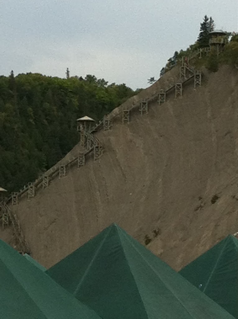 Montmorency Falls is a waterfall just a few minutes drive outside of the city, and it is 50% taller than Niagara Falls!  Now, Niagara is a lot wider, and has a lot more water going over it, but still, height counts for something, right?  When we arrived we had the option of either taking the cable car up to the top, or hiking up almost 500 stairs that looked like they were about to slide off of a giant sand pile.  As we stepped off of the cable car, we found ourselves in front of a large and beautiful building that looked like it was hosting a wedding, which we reluctantly decided not to crash.