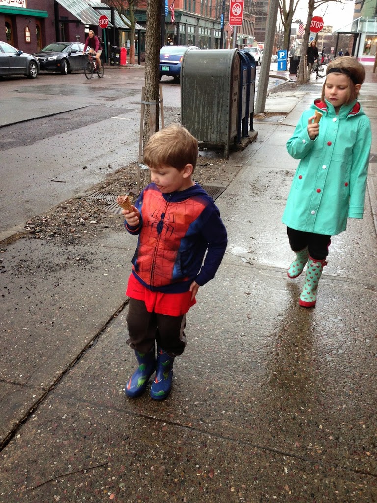 Out of nowhere, perhaps sensing our increasing despair, a young employee walked up to us from the midst of the mist and asked if we would like a trivia question.  I said yes, and he asked me what happens to discontinued ice cream flavors.  I knew this!  They go to the flavor graveyard!  I have been there many times!  And just like that, we had four front-of-the-line passes in hand and were walking through the front door into the warm, delicious air of the scoop shop.  It was a Free Cone Day miracle.