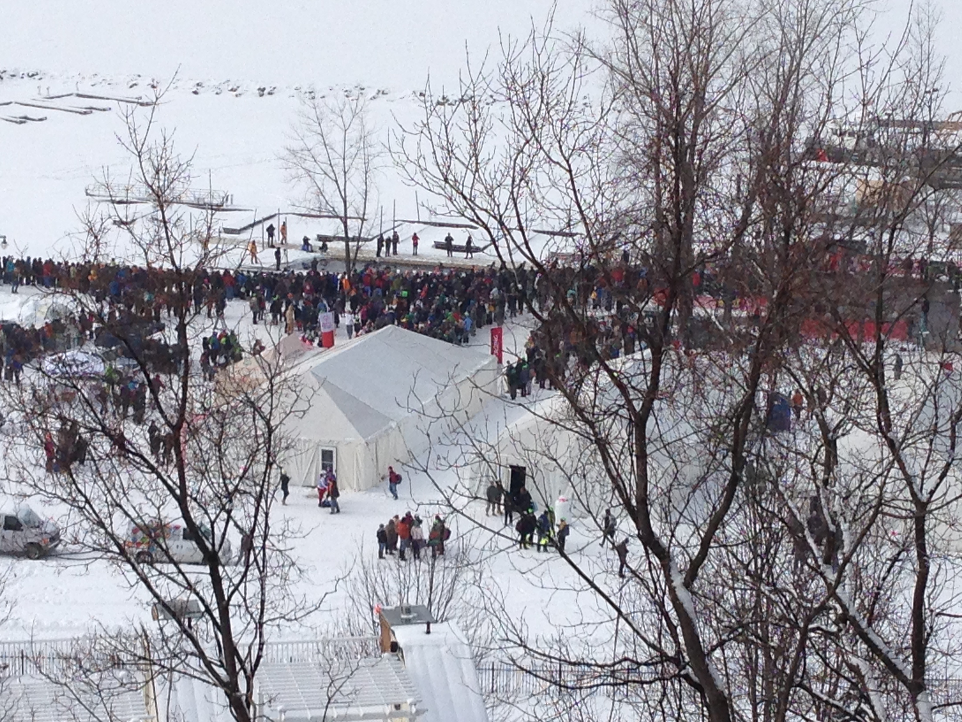 Yes, I found it, and I could see the tiny ant-people moving around near the tents, and I could hear everything over the loudspeakers. They were calling the first wave. “Waves 9 through 14, please get ready,” I heard them say. Oh no. We were going to miss it after all. I looked up and down the top of the cliff, looking for a way down, but there was none. I was sure that, somewhere under 2 feet of snow, there was a slightly treacherous path, but I couldn’t see it. If we wanted to get down there, we were going to have to walk all the way back down to where the traffic was turning in, and then all the way back here again. It was going to be 30 minutes at least, and that’s if Edward could keep up. As the first wave of people splashed into the lake, I realized that in order to get down there and support my family, there was only one option. We were going to have to take a plunge of our own. “Edward,” I said ominously, “come sit on my lap.”