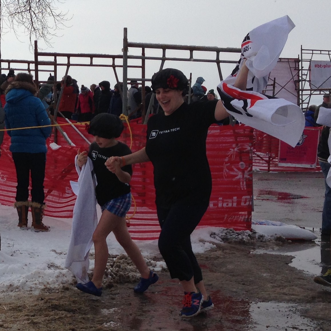 We could see, across the way, the insane people plungers run towards the water, and we could hear them going in and splashing about, but then we had the perfect spot for congratulating the wet people on their way back to the heated tents. Edward and I relaxed and had plenty of time to see wave 14 do their thing. It was great. We cheered extra loud for our family as they raced past us looking for dry clothes.