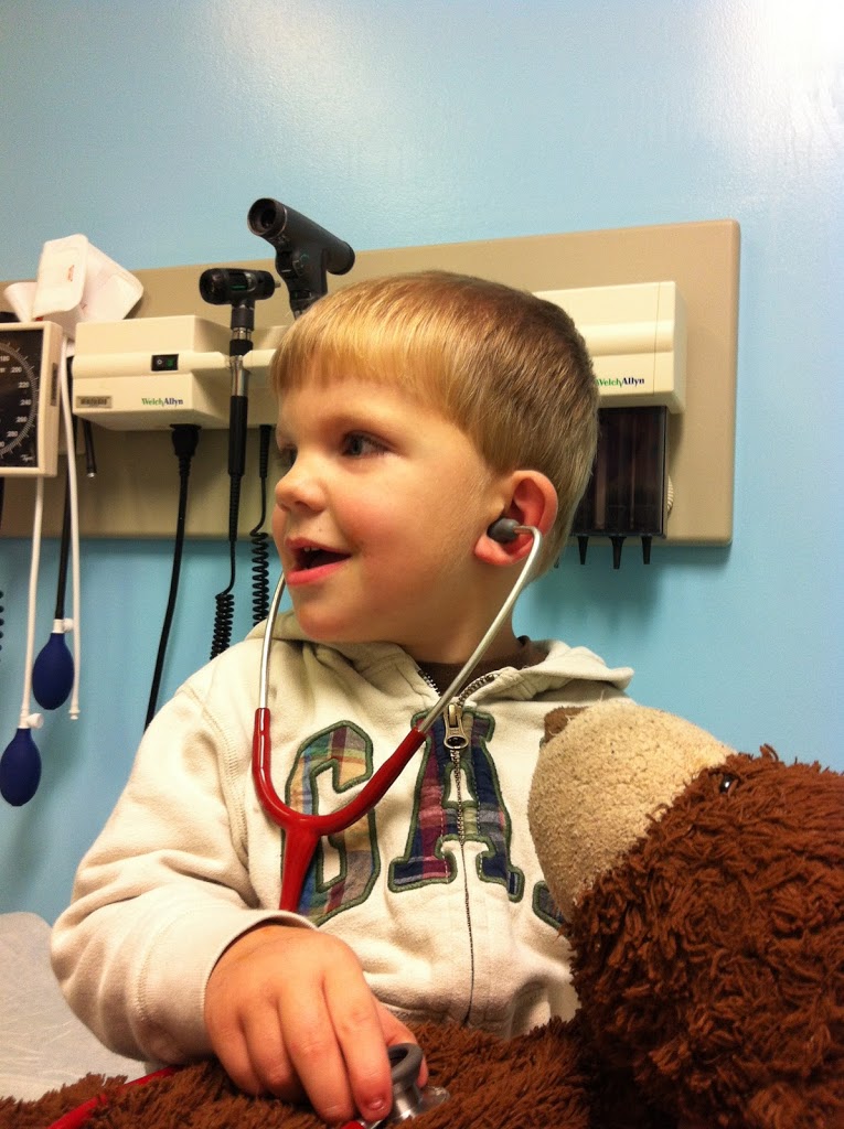 On Tuesday, we finally got the chance to sit down with her neurologist and talk things over. The first thing we talked about was why my son Edward had taken an orange marker and decorated the exam room. The answer: because he is two. He really wanted to be included in the appointment, so while the doctor checked Ruby out, Edward stole some of the doctor’s equipment and gave a checkup to Daddy Bear.