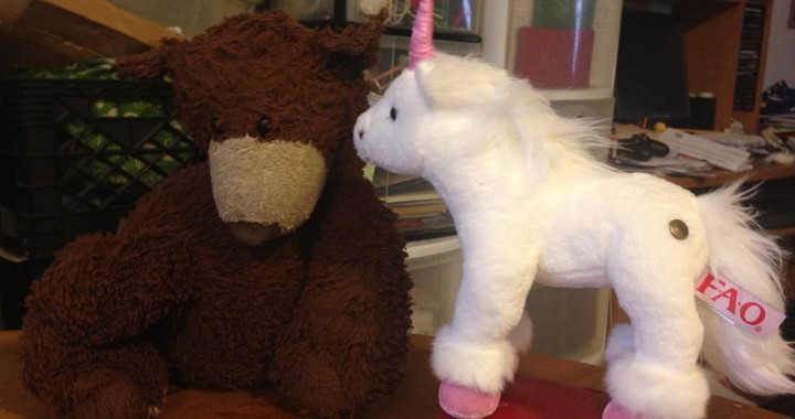 The thing he wanted most for his birthday was a pet, because I guess he was jealous of our new puppy, so Ruby got him a pet unicorn, which he really enjoyed. Also, oh, wait a second, apparently I am being told that Bear wants to say something to you all.