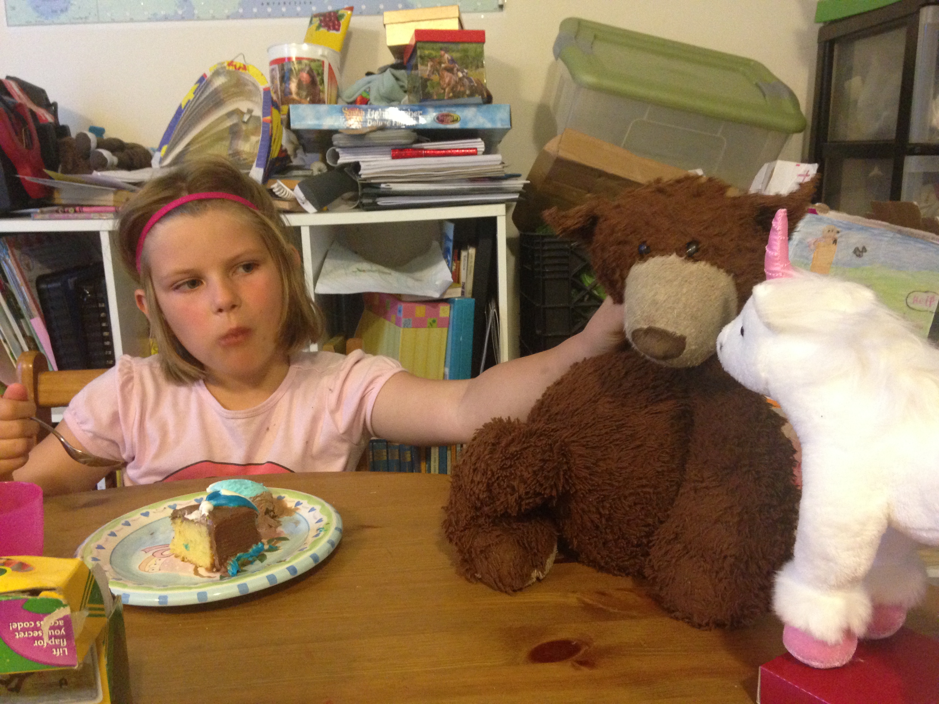 The thing he wanted most for his birthday was a pet, because I guess he was jealous of our new puppy, so Ruby got him a pet unicorn, which he really enjoyed. Also, oh, wait a second, apparently I am being told that Bear wants to say something to you all.