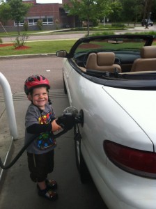 Edward, my three year old, is very interested in cars.  Lately he has been extra interested in gas and gas tanks.  He fills up his toy cars with “gas.”  He makes his bike stop at the “gas station” for gas.  Every time we walk through a parking lot he tried to open all of the gas caps of every car we pass, despite my repeated pleas to cease this behavior before we all get in trouble.  But it occurred to me that he has never really seen an actual car fill up with gasoline.