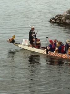 So, still pretty cool, even if they weren’t actual dragons.  We got to see a couple of races, and I think we got the basic idea of how these things work.  First you fill your boat with rowers.  This is to make the boat go.  Then, you put a guy up front on drums, Ben-Hur style.  This is to make the rowers go.  The rowers row in time with the beating drum, so basically whoever has the fastest drummer, wins the race.  This is why, traditionally, all races are won by Animal, the popular drummer from The Electric Mayhem.  Since Animal has a very busy schedule, what with his new movie coming out in November and all, he is generally unavailable to be on one’s dragon boat team.  To compensate for this, the drummers try to channel the spirit of Animal by dressing in outlandish costumes while shouting and growling as loudly as possible.  We saw several great costumes out there, including one person dressed as the sun.  Here is a good shot of someone dressed either as a viking, or an opera singer: