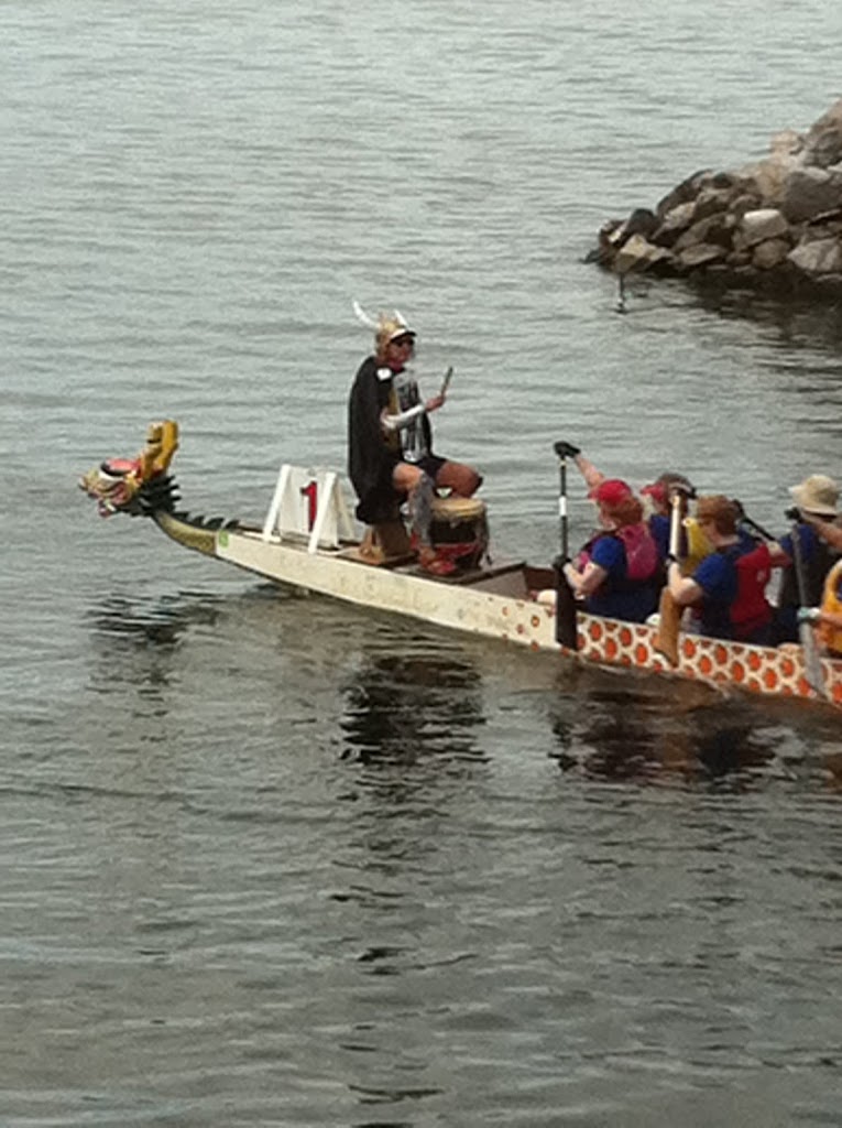 So, still pretty cool, even if they weren’t actual dragons.  We got to see a couple of races, and I think we got the basic idea of how these things work.  First you fill your boat with rowers.  This is to make the boat go.  Then, you put a guy up front on drums, Ben-Hur style.  This is to make the rowers go.  The rowers row in time with the beating drum, so basically whoever has the fastest drummer, wins the race.  This is why, traditionally, all races are won by Animal, the popular drummer from The Electric Mayhem.  Since Animal has a very busy schedule, what with his new movie coming out in November and all, he is generally unavailable to be on one’s dragon boat team.  To compensate for this, the drummers try to channel the spirit of Animal by dressing in outlandish costumes while shouting and growling as loudly as possible.  We saw several great costumes out there, including one person dressed as the sun.  Here is a good shot of someone dressed either as a viking, or an opera singer: