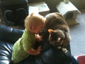Now, the cats do not like this, so at first they made hissing noises and swatting motions. They are not stupid. They remember the last time there was a baby around. They are not interested in having their bits and pieces mauled by a one year old. Sadly, Edward did not get the message from the hissing and swatting. He continued to torment them, and they moved on to light biting and scratching. No skin breaking, but they definitely stepped up the aggression. Unfortunately for the cats, their parents just don’t understand, and when they try and bite the baby, they get smacked and/or thrown outside.