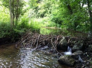 Now, I have not personally seen any beavers around, but our neighbor downstairs saw it. She didn’t know about the dam, but she swore she saw the beaver early one morning, sitting on the edge of our yard chewing on a stick. When we told her about the dam, she was excited, and we were all happy to have beaver confirmation. Ruby and I went out to look at the stream again yesterday, and the dam looks like this now: