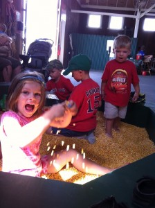 Here is a fun tip for you: walk past all of the animals on your way in and head straight to Old McDonald’s Barn, because there they have an animal scavenger hunt, and if you go to all of the animal tents (which you were going to go to anyway, because they are free and cute), you get a ticket for a free ice cream cone!  We saw the cows.  We saw the horses.  We saw pigs, rabbits, oxen, chickens, ducks, swans, sheep, llamas, alpacas, and a turkey.  And when we were done, we got to go play in the corn box, which is like a sandbox but with, you know, corn!