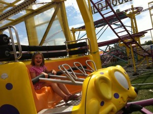 Having completed our scavenger hunt, Ruby really wanted to go on the Wild Mouse ride, which was possibly her favorite thing that she did during all of last year.  Supposedly her ribbon qualified her for a free ride, so I went to the ticket booth and demanded one!  They told me that they didn’t know anything about that, and I would have to go to the main fair office.  But the main fair office was not on my map, so I grabbed a couple of emergency medical workers, who I’m sure had nothing better to do, and asked them about it.  They had no idea, so they radioed in to the boss and we finally got a location on that main fair office.