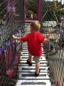 After that, she and Edward wanted to go on the obstacle thingy with the big slide at the end, and Edward was big enough to do that one, but only with an adult, so up the rope net I went.  I almost got stuck in the slide, but we all made it through without incident, and that left us with two tickets.
