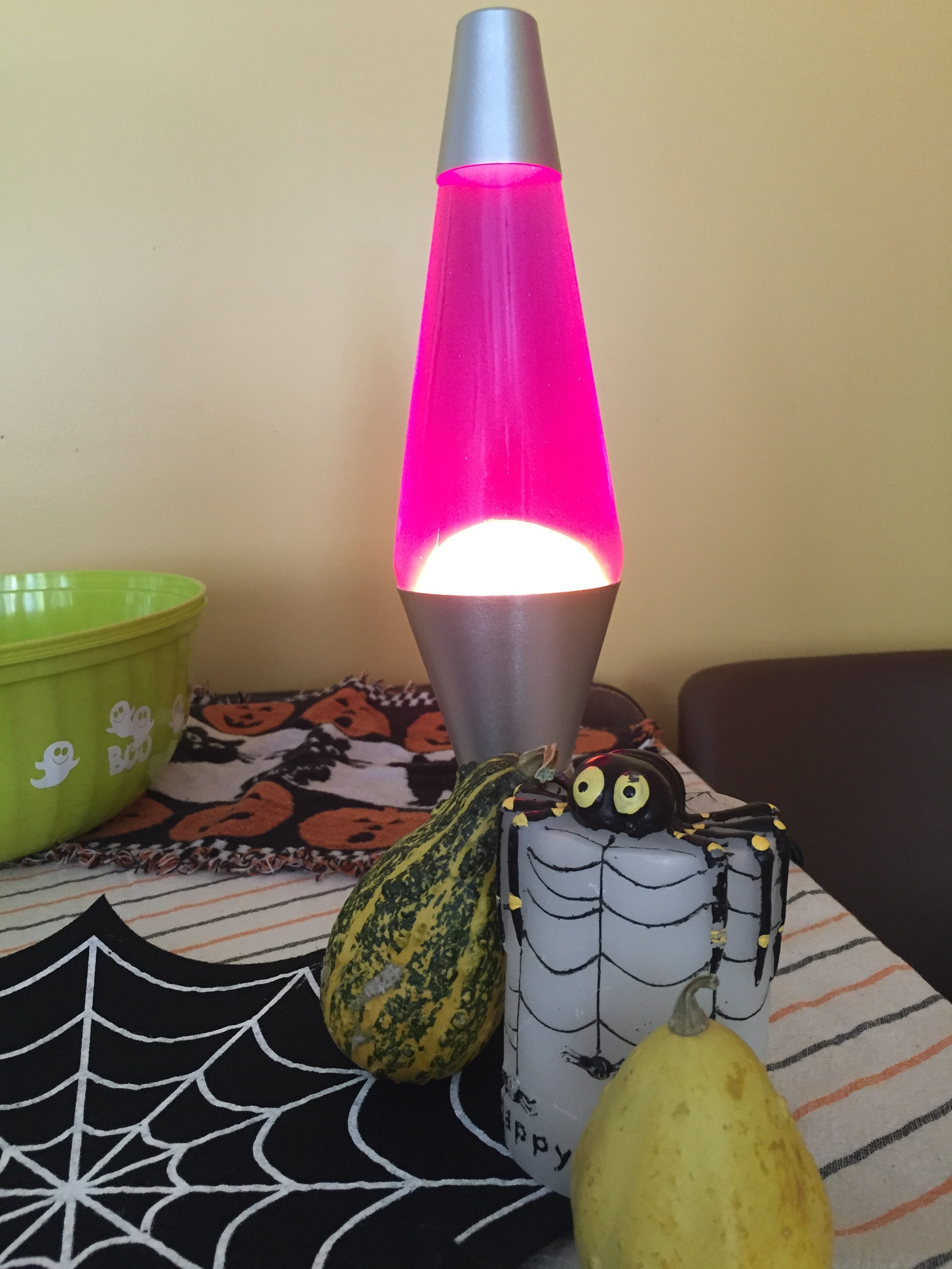Last week I never would have dreamed that I would be actively trying to forget one of my favorite days of the year, which is why I asked for the lava lamp to begin with. I thought it would be perfect for our now-annual Halloween dance party, and I pitched those lava lamp people this idea for a blog post centered around a party, with their product front and center and featured in all the pictures and paragraphs. I would associate their device with fun and happiness, and everyone would rush out to buy one. After all, they have new Halloween colors for their 50th anniversary! A spooky black and white model, or the one I chose in purple and orange. This was going to be a slam dunk post, and I was going to get a free lava lamp. How could I have known how the day was going to turn out?