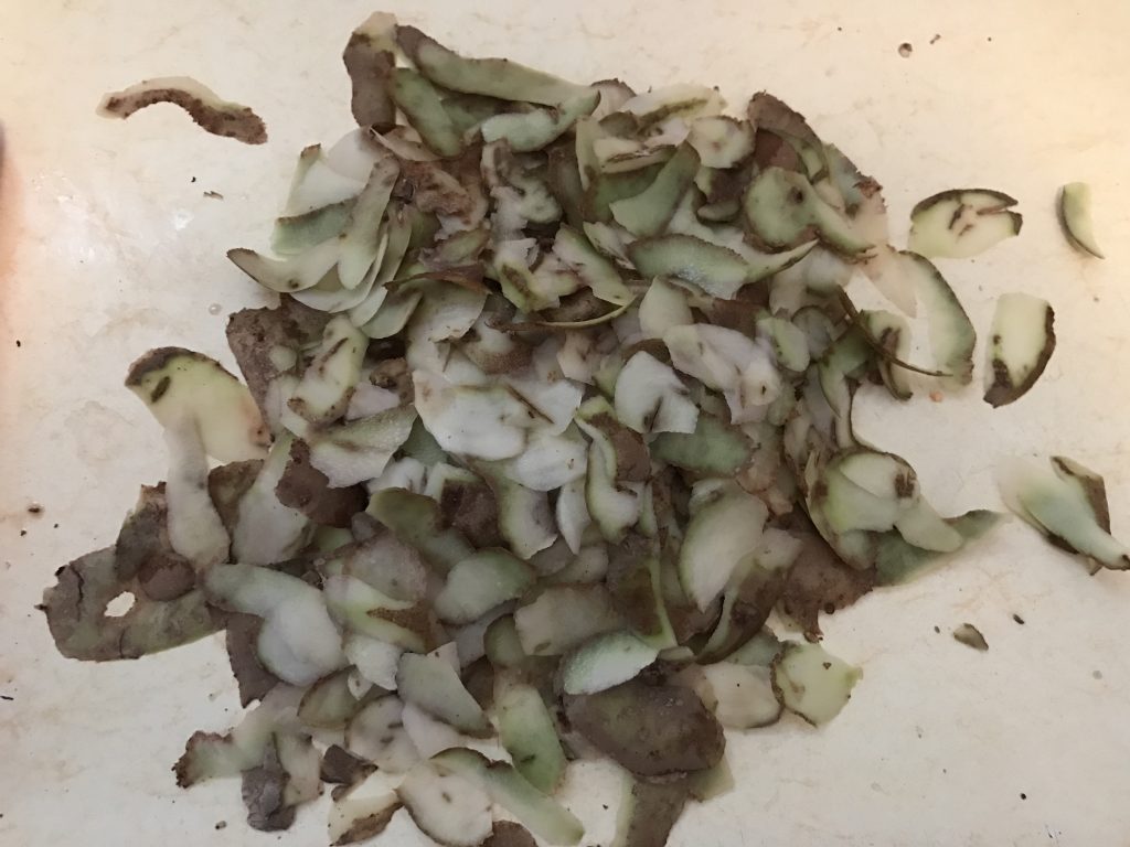 2. Peel some potatoes. How many? Yeah, that’s the thing with potatoes; they are different sizes. I could say “eight potatoes,” but that could give you the wrong amount of potatoes. I could say “two pounds of potatoes,” but you are not in Europe! You do not have a kitchen scale! And if you ARE in Europe, you think of “two pounds of potatoes” the way I would think about “two dollars of potatoes.” Again, not helpful. The price might change. So instead, I will show you a picture of all the skins after I peeled them. Peel potatoes until you have that many skins on the counter.