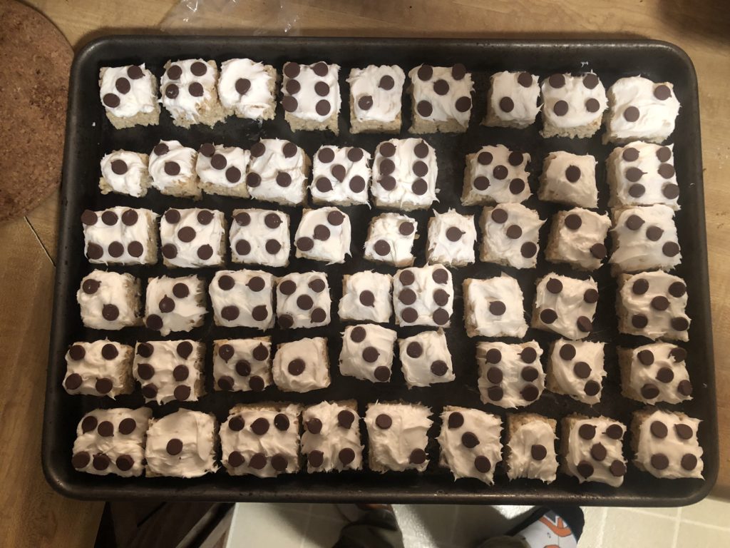 Yeah, that’s right, you heard me. Dice Krispie Treats. Delicious treats cut into cubes and frosted with chocolate chips added to make them look like dice. And as a bonus? They were so frickin’ good! These things did not last the weekend, even though I made two trays worth.