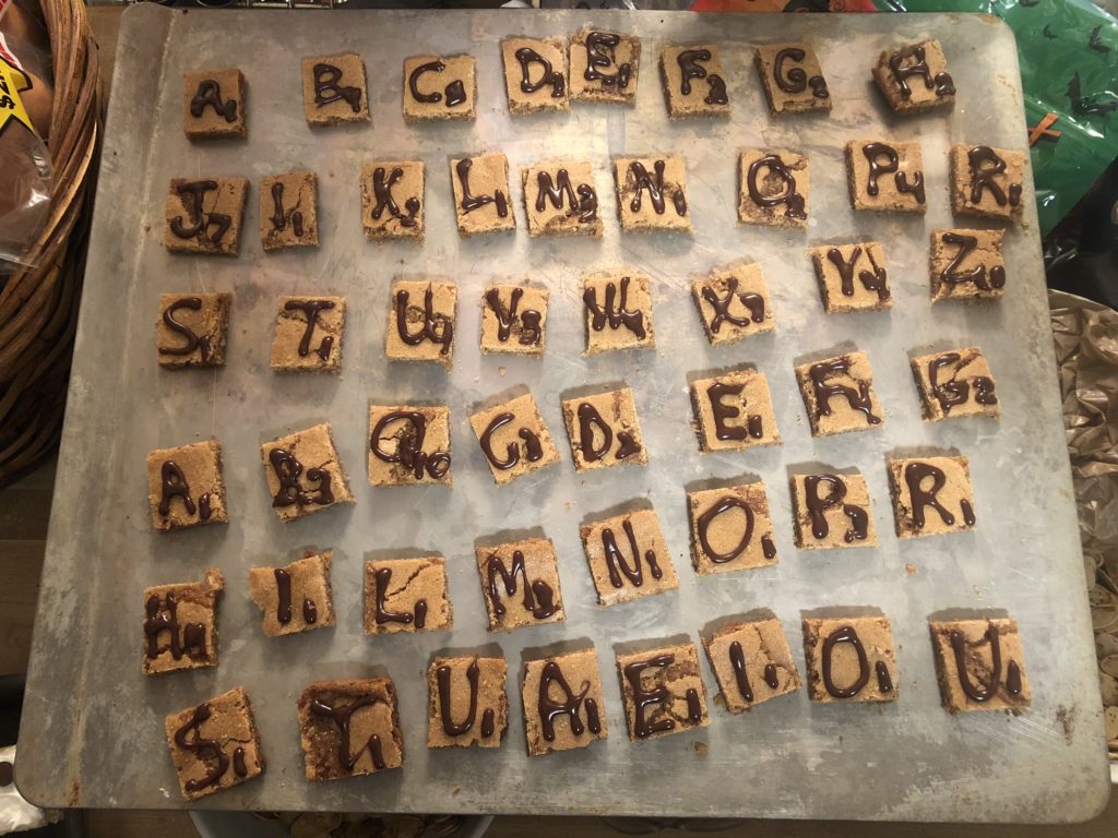 But lest you think I would stop there, I also decided to make cookies shaped and frosted to look like playing cards. Also a terrible idea. But I figured out what a bad idea that was in time to stop myself. Instead, I hit upon the idea to make Scrabble tile cookies. The trick being that I needed to make them into squares, I considered shaping squares before baking, but would they hold their shape? But if I baked them into a pan as one giant cookie and then cut them, would they crumble apart? I had to make my own recipe. Which I did. I think they turned out okay.