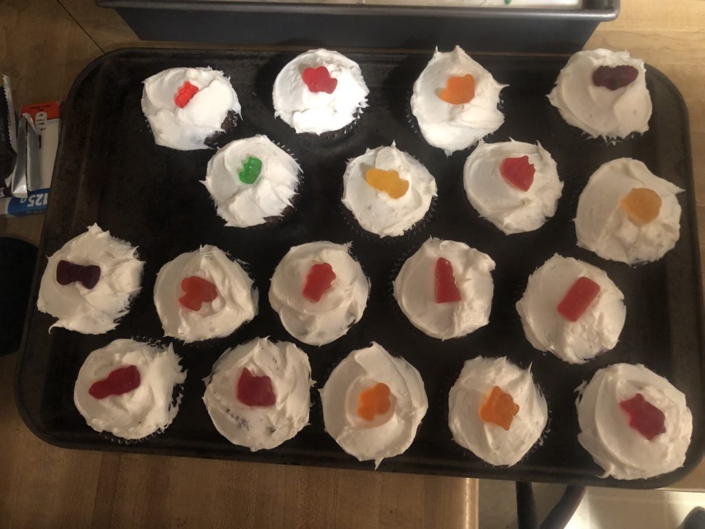The first brilliant idea I had was to make cupcakes and top them with game pieces from prominent board games that I had carved out of marshmallows. Obviously this was a terrible idea, and I abandonded it quickly. That was way too hard. But we did have some game-piece shaped gummies that I used to top the treats, and that worked out well. But then I had my second brilliant idea, and this time it was actually brilliant. Dice Krispie Treats.