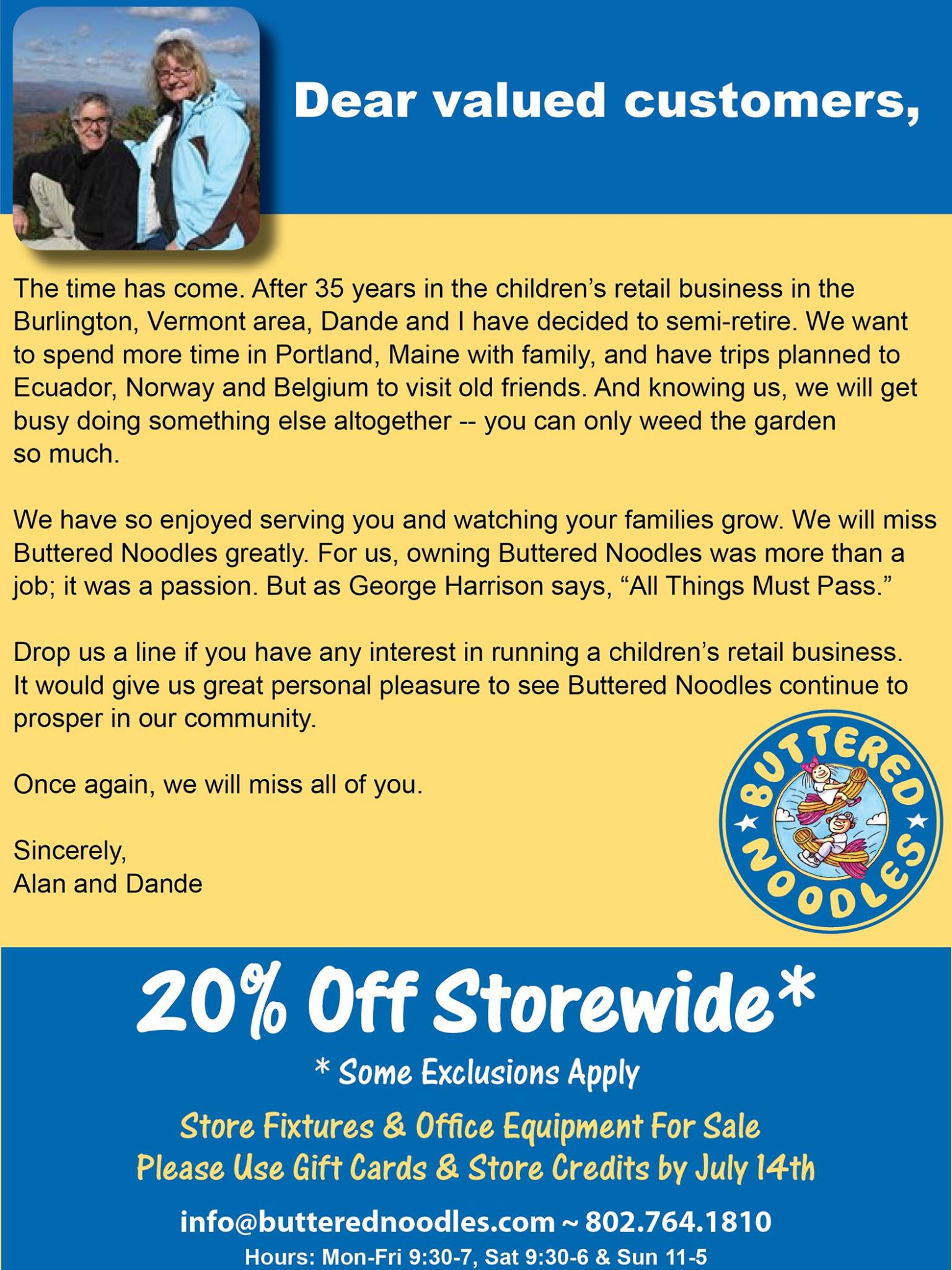 People! I have terrible news! I know that you are all currently jumping around your rooms for joy at all of the other wonderful news that has come your way recently, but you may have missed this devastating announcement. Buttered Noodles is closing. First Kids City, which was our personal favorite toy store, went out of business, and today the owners of Buttered Noodles put this picture up on their Facebook site: