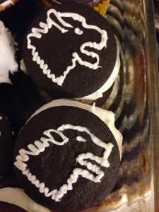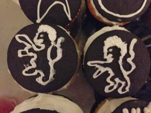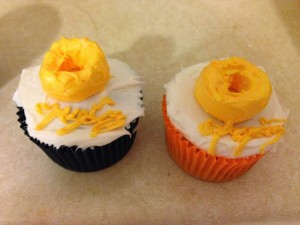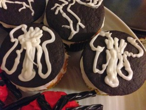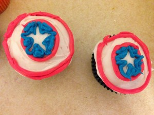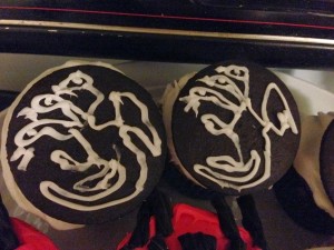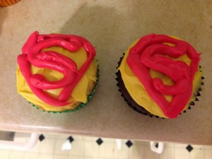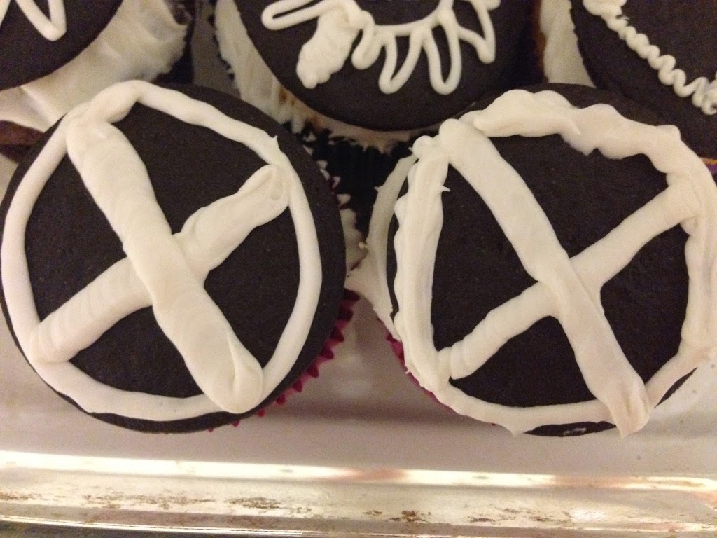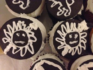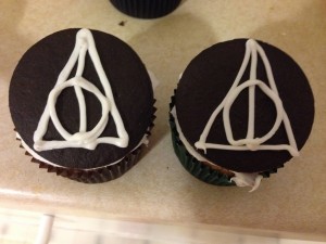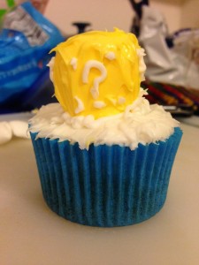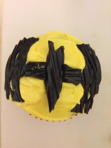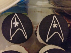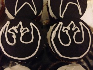 I am leaving today to spend the weekend with a bunch of weirdos. We are going to play board games and video games and do nerdy things like talk about geeky stuff. I know. It’s going to be awesome. As part of this weekend we have each been assigned to bring part of the food, and I am in charge of desserts. Since this is an official nerd event, I thought that I ought to make the dessert as geeky as possible, so I made cupcakes, each representing something that will most likely be discussed at some point during this weekend, and I’m bringing them with me.