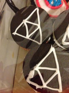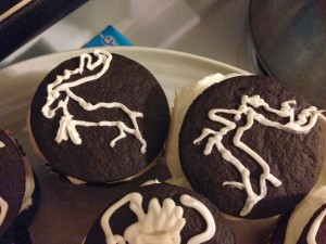 Now, most of you are probably not going to get to go to nerd weekend, but I thought you might enjoy the cupcakes anyway. The only potential problem is, it is 2 am and I have been decorating these darn things for hours and I can’t tell if they look like what they are supposed to look like. My brain is most of the way asleep at this point. So to double check this, I present you with The Nerd Cupcake Challenge. I will show you pictures of the cupcakes, and you tell me what you think they represent, and the first person to correctly guess what I was attempting to signify with all of my desserts will win some sort of prize that I will figure out later, but will probably not be a cupcake, unless you live near me and then it might be a cupcake. Ready? Here we go!
