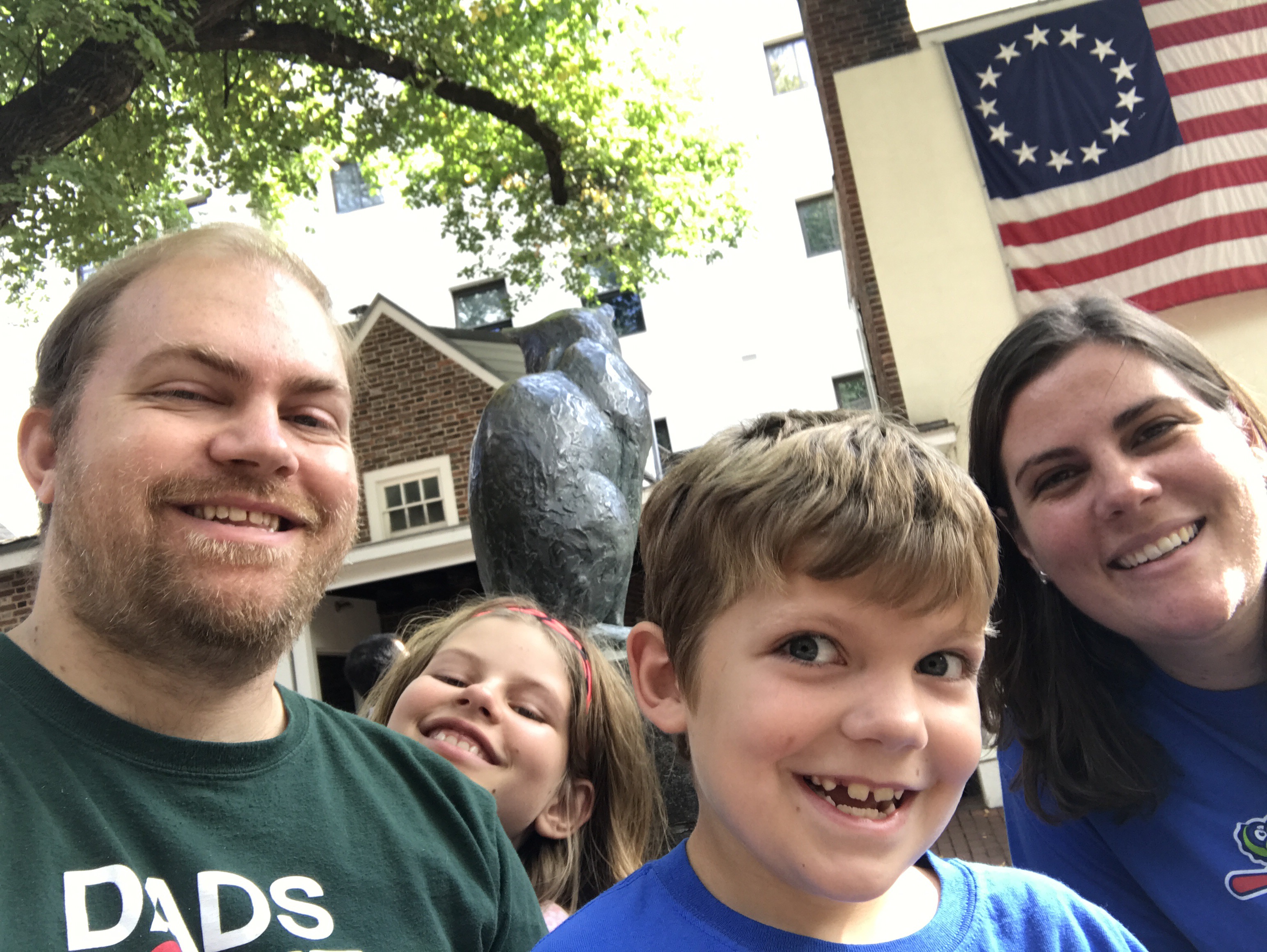We also stopped over at Betsy Ross’s house, and the kids liked looking at the big flag, but not as much as they liked the fountain with the cats. They didn’t really have any interest in going inside. But we told them the story anyway, and they liked that well enough.